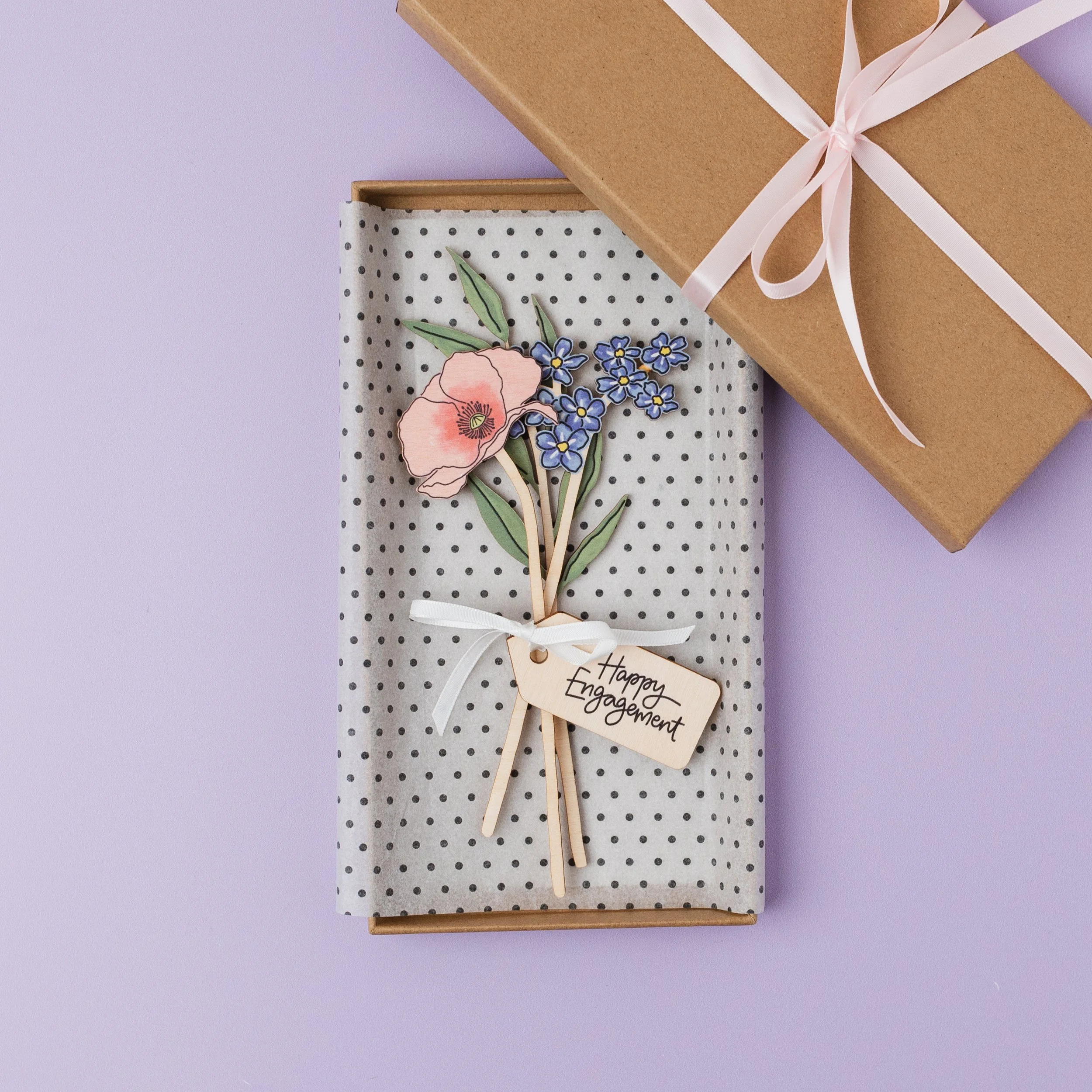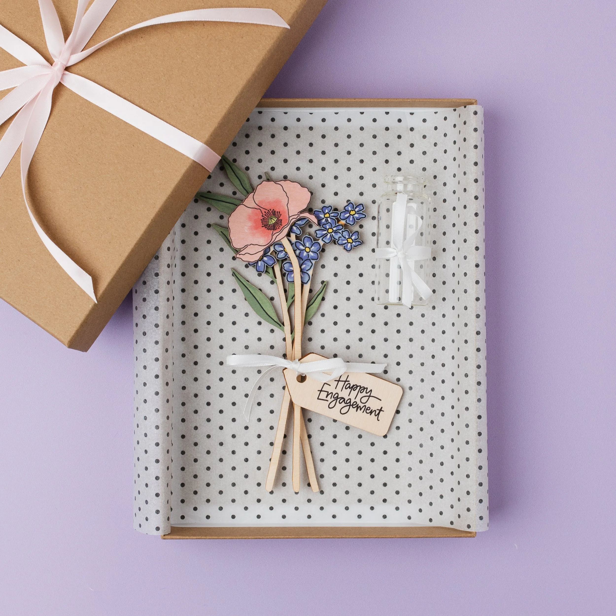 Gift this wooden flower bouquet to the lucky couple to celebrate their engagement. This cheerful bouquet of letterbox flowers includes a poppy, forget me nots and a fern leaf and makes the perfect engagement gift to commemorate this exciting time.